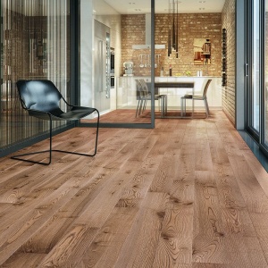 Напольное покрытие в виде цельной деревянной доски. По ее периметру нарезаны шипы и пазы, с помощью которых планки из массива соединяются на полу.